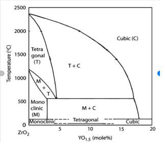 Phase diagrams for materials [specifically metals] typically will depict the eutectic -liquid to 2 solid phases-, eutectoid -solid to 2 solid phases- , peritectic -liquid + 1 solid phase to another solid phase-, and peritectoid -2 solid phases to 1 solid phase- reactions; however, this one is more useful for understanding the atomic structures of the material and the temperatures at which the desired tetragonal phase forms. An example that shows the melting point and liquid phase can be seen in figure 3. As previously mentioned, the tetragonal structure is the one of interest. This phase is most reliably present at approximately 1200 C and 1.5 % moles of YO1.5 (Witz, Gregorie).