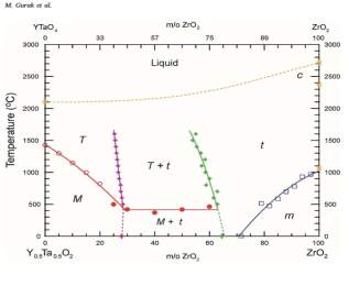 Figure 3 depicts Yittrium Tantalate phase diagram with zirconia with particular structures, phases, and temperatures clearly labeled as well as the rough percentage of ZrO2 moles present. It should be noted that this is a different material that zirconia is being doped with, and it will have slightly different physical properties because of this [hence the difference in melting temperature].