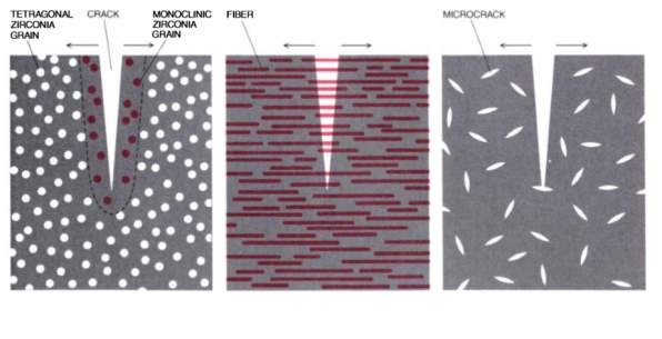 The aforementioned transformation is the ‘stress induced transformation toughening’ discussed above which is the unique property that makes this material ideal for dental applications. This occurs in materials that have tetragonal and monoclinic structure. It allows for “a crack in a ceramic [to be] arrested…” which is a benefit of “new processing techniques that seek to eliminate crack-initiating imperfections. Transformation toughening (left[of figure 4]) relies on a change in crystal structure (from tetragonal to monoclinic) that zirconia, or zirconium dioxide (ZrO,), grains undergo when they are subjected to stresses at a crack tip. Because the monoclinic grains have a slightly larger volume, they can "squeeze" a crack shut as they expand in the course of transformation. Ceramics can also be made crack-resistant by interlacing with fine ceramic fibers (middle), as is the case in composite materials. The fibers span a crack and keep it from becoming wider and growing. A third way to stop a crack is by spreading the stresses concentrated at its tip over a larger surface. This can be accomplished if minute cracks, called microcracks (right), are purposely created in the ceramic material during processing. When an approaching crack merges with a micro crack, its tip is blunted”(Bowen, Kent H.).