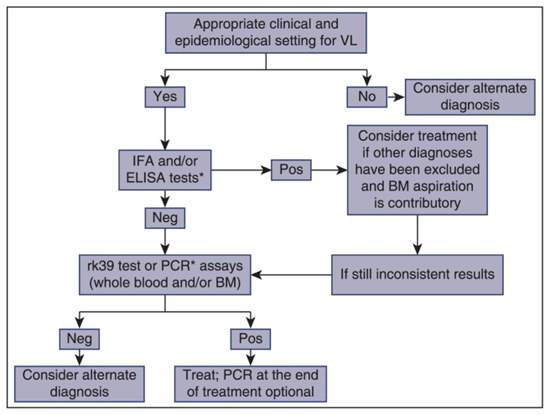 Diagnostic techniques to identify leishmania in human patients have changed substantially over the years; previously techniques where mainly invasive and relied heavily on the techniques of examining bone marrow and splenic aspirates (Zijlstra et al., 1992). Today, however, molecular techniques such as PCR and serological tests using recombinant kinesin antigen (rK39) are considered most effective despite risks relating to sensitivities and adaptability to the field. For diseases such as Leishmania, where endemicity plays a big role in the likelihood of symptoms being due to the disease, deciding on appropriate action based on clinical setting can be essential to the rapid diagnosis. Figure 1 shows a proposed algorithm for the diagnosis of Visceral Leishmania; by following an algorithm the most effective route of diagnosis for the disease can be identified.