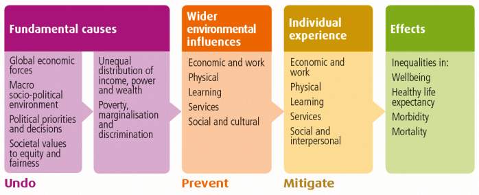 The diagram above shows the various causes of health inequalities divided into different categories of fundamental causes; environmental influences; and finally individual experiences which finally in-turn lead to the disparity in wellbeing and health of different groups or individuals.