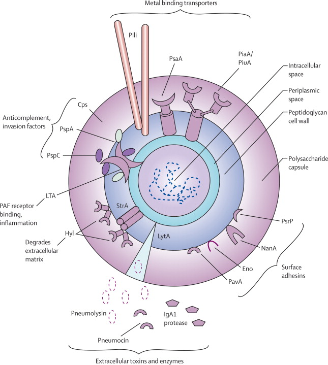 Figure 1. Picture taken from Van der Poll and Opal (2016). Diagram of the Streptococcus pneumoniae bacterium. The polysaccharide capsule depicted, is one of the main targets for vaccine development due to the fact that the capsule is one of the main virulence factors that enables the bacteria to evade host immune response. The pili, which are illustrated, allows for the bacterium to attach to host cell surfaces to commence cell assault. Pneumococcal serine-rich repeat protein (PsrP) is also shown and it mediates attachment to the lung epithelial cells and is encoded by a pathogenicity island.