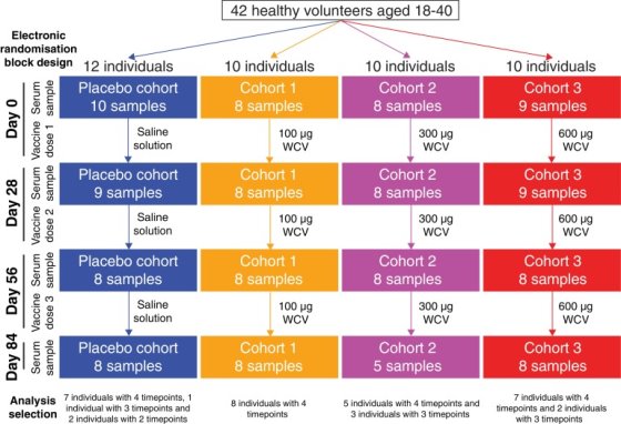Figure 2. Flow chart taken from Campo et al., (2018) depicting the sample collection of data for the trial. 12 individuals constituted the placebo trial with the first sample of serum being taken on day 0 before vaccine dose. 10 individuals constituted the 100µg, the 300µg and the 600µg cohorts being vaccinated with the WCV, with each of them having their serum levels taken on day 0 before the vaccine dose. Each individual’s in the cohorts had differing time points.